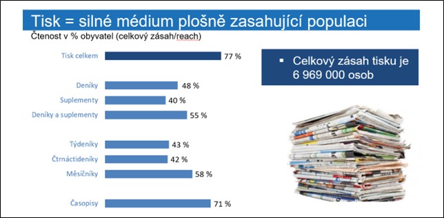 (Praha, 14. srpna 2025) Nejnovější výsledky jednotného výzkumu čtenosti periodického tisku MEDIA PROJEKT za období od třetího čtvrtletí 2024 do druhého čtvrtletí 2025 byly předány a zveřejněny ve čtvrtek 14. 8. 2025 v Presscentru ČTK. Printové tituly dosáhly i za toto období opět průměrného zásahu 77 % české populace ve věku 12 až 79 let, což představuje 6 969 000 osob. Tisk je stabilním a silným médiem, protože ve stejném období 12 měsíců, jako jsou výsledky MEDIA PROJEKTU, bylo prodáno více než 86 milionů jednotlivých výtisků deníků a více než 64 milionů výtisků časopisů (období 1.7.2024-30.6.2025, zdroj: auditem ověřená data ABC ČR).