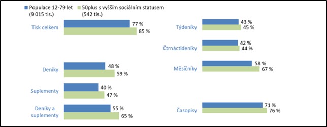 Realizátoři výzkumu se ve své prezentaci mimo základních výsledků věnovali také čtenářskému chování cílové skupiny 50+ s vyšším sociálním statutem. Příslušníci této skupiny vykazují výrazně vyšší afinitu ke čtení tištěných médií v porovnání s průměrnou populací (viz graf níže) a díky příjmům a společenskému postavení jsou významnou inzertní cílovou skupinou. Podobnou významnou sociodemografickou skupinou, kterou lze efektivně oslovit tiskovou reklamou, je například prémiová skupina čtenářů vlastnících rodinný dům a disponujících čistým příjmem nad 50 000 Kč, jejíž čtenářské chování bylo také tématem prezentace. Jako obvykle zazněly na srpnové prezentaci také informace o čtení v letním období, kdy stoupá čtenost některých žánrových skupin tisku o 5 až 10 %.